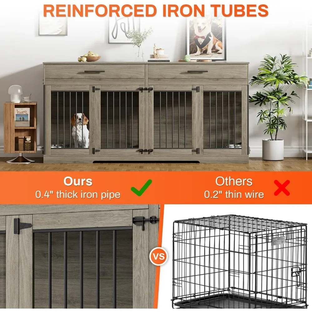 【Double Dog Crate Furniture】This large dog crate with dividers is suitable for more than 2 dogs to rest. You can also remove the divider to provide more space for interaction between dogs, making it an oversized dog crate for large medium dogs. Dimensions are 72.0"W x 23.6"D x 35.2"H. Please measure your pet before purchasing.