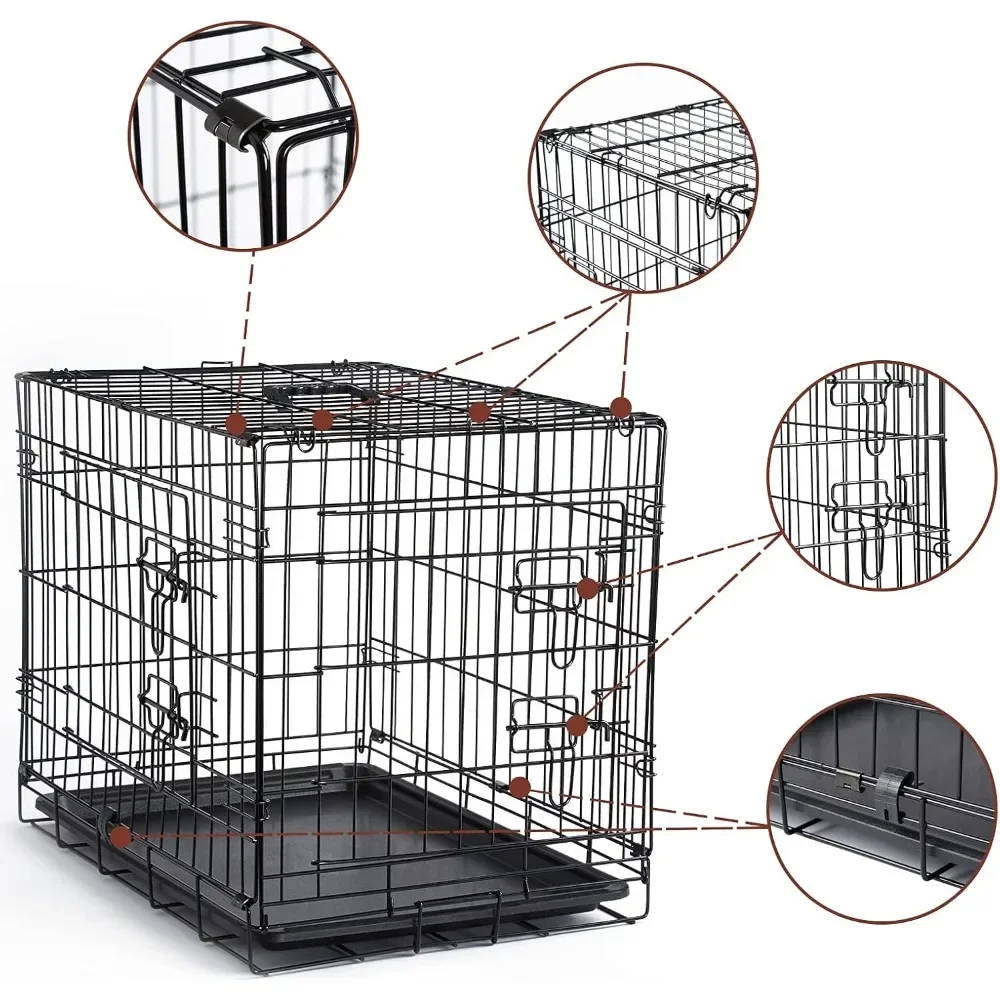 - SAFE & SECURE CONSTRUCTION: Two door dog kennels is constructed from durable metal wire. Each door have 2 heavy duty slide-bolt latches securely lock dog kennel door in place, keeping your dog safely inside their space.