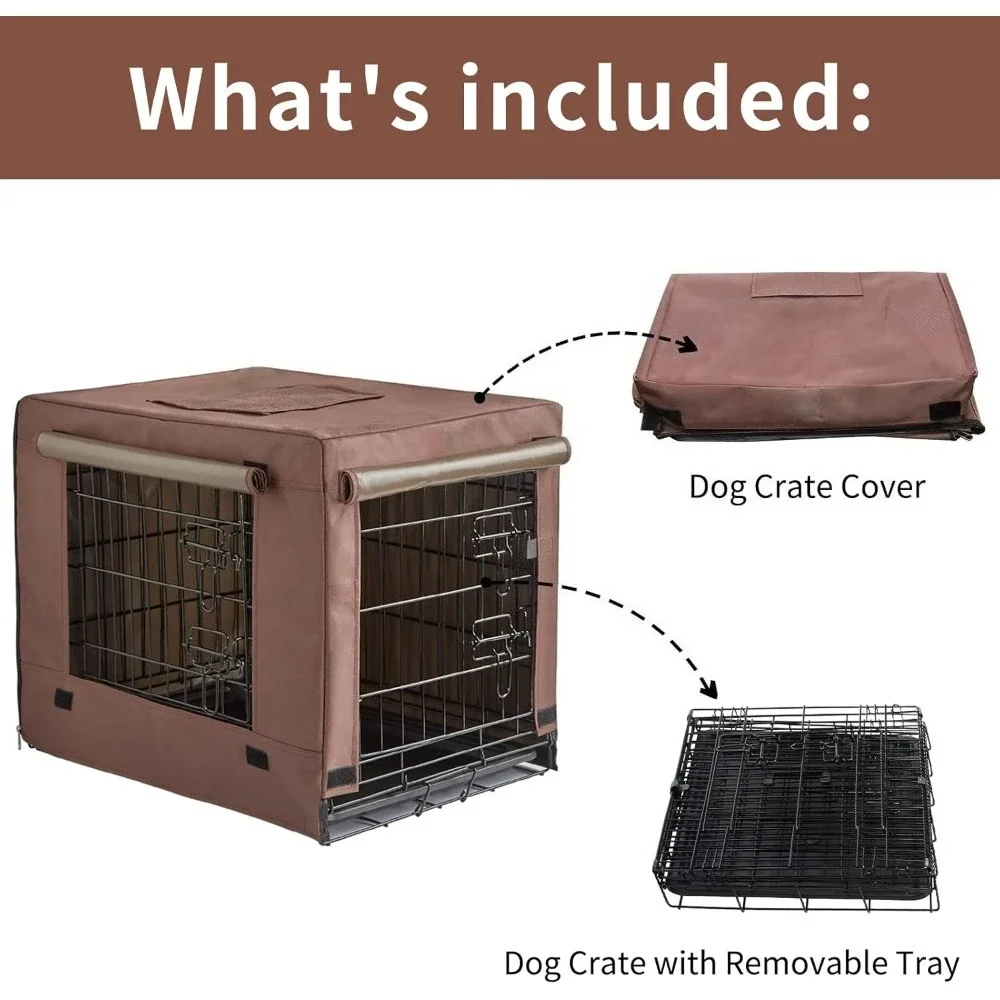 - FULLY EQUIPPED 36 INCHES DOG CRATE KIT: Include 1 x double door 36" dog crate, measures 36L x 23W x 25H inches; 1 x brown puppy crate cover, 1 x carrying handle & 1 x leak-proof removable dog tray. Ideal for medium/large dog breeds.