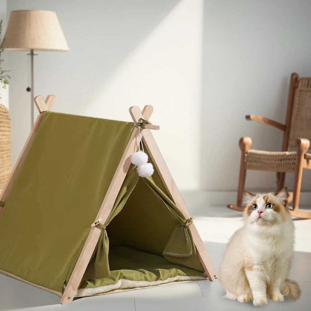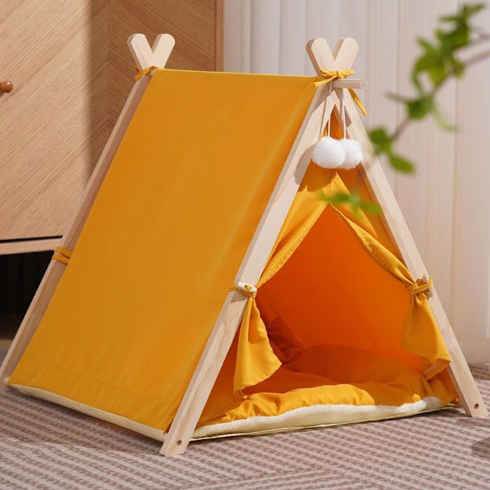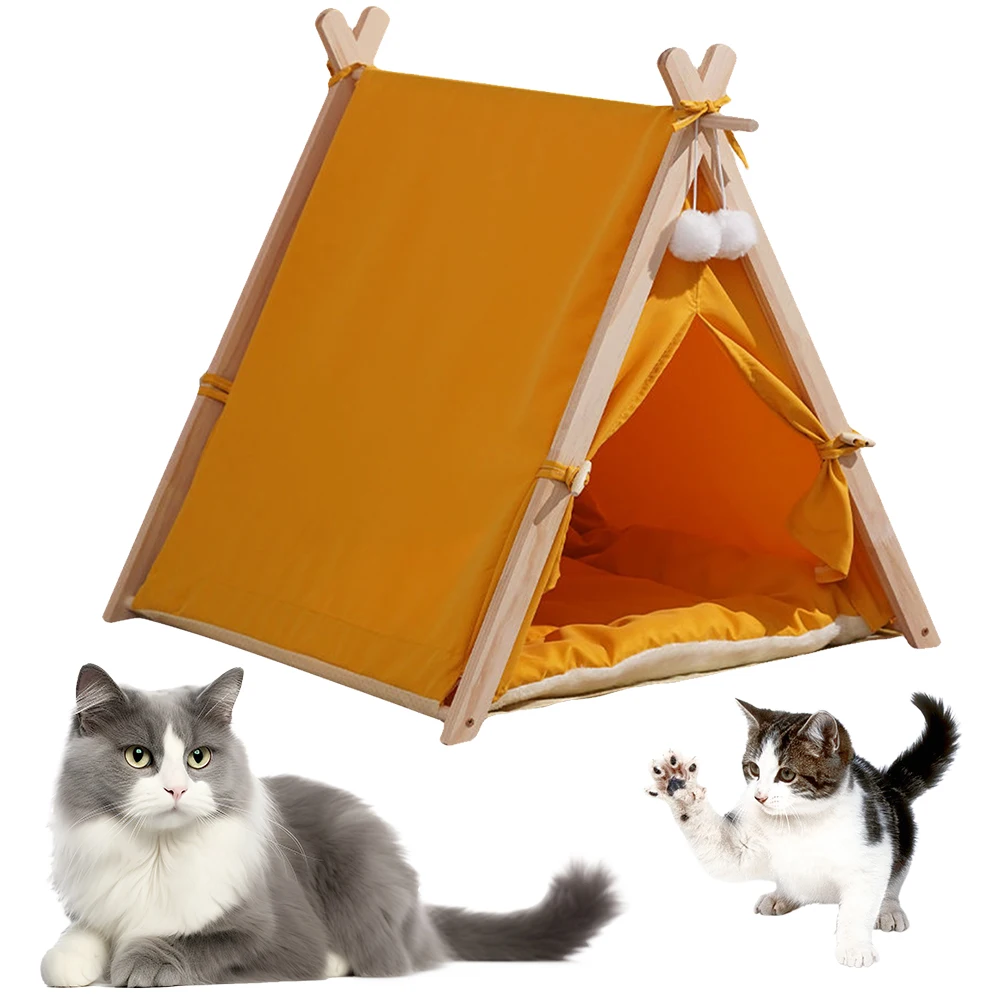 Pet Tent Wooden Frame Portable Pet House Oxford Fabric Wood Cat Dog Tent Washable Portable Removable Dog House with Soft Cushion