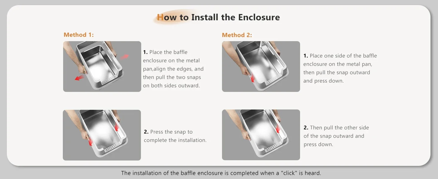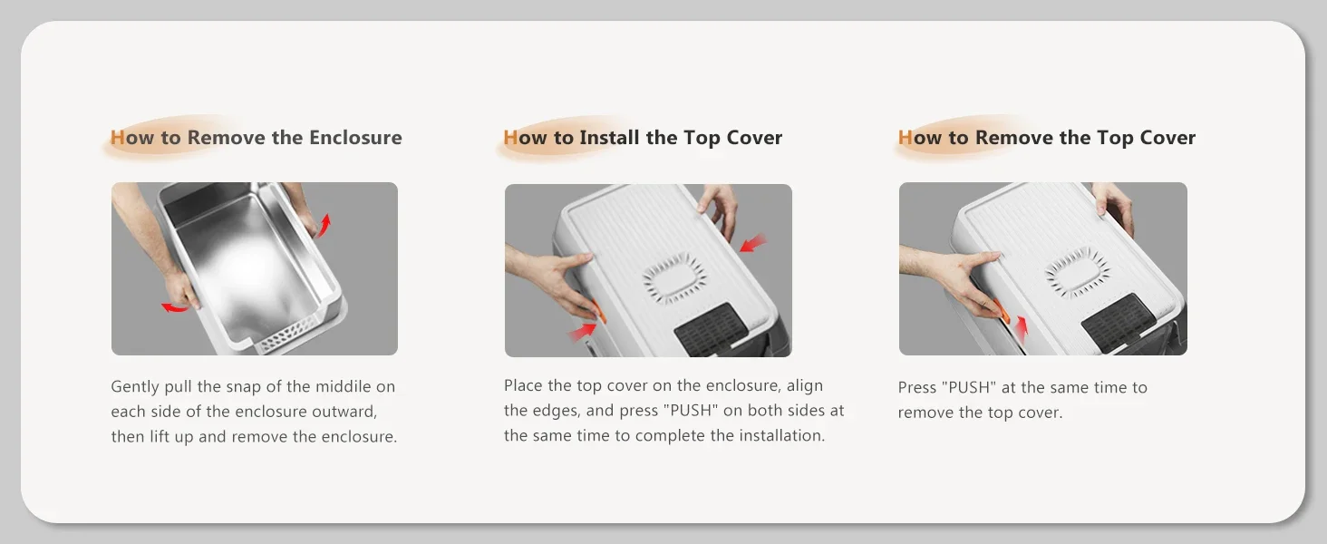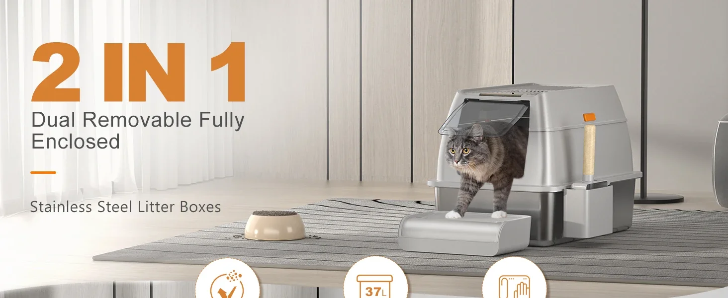 【FULLY ENCLOSED AND SEMI-ENCLOSED】 Our stainless steel cat litter box features an easy-to-assemble, 3-layer detachable shell that offers both fully enclosed and semi-enclosed configurations.The fully enclosed setup prevents odor from spreading, effectively stops urine leaks, and provides privacy for your cat.The semi-enclosed setup promotes ventilation, making it easier for owners to clean.