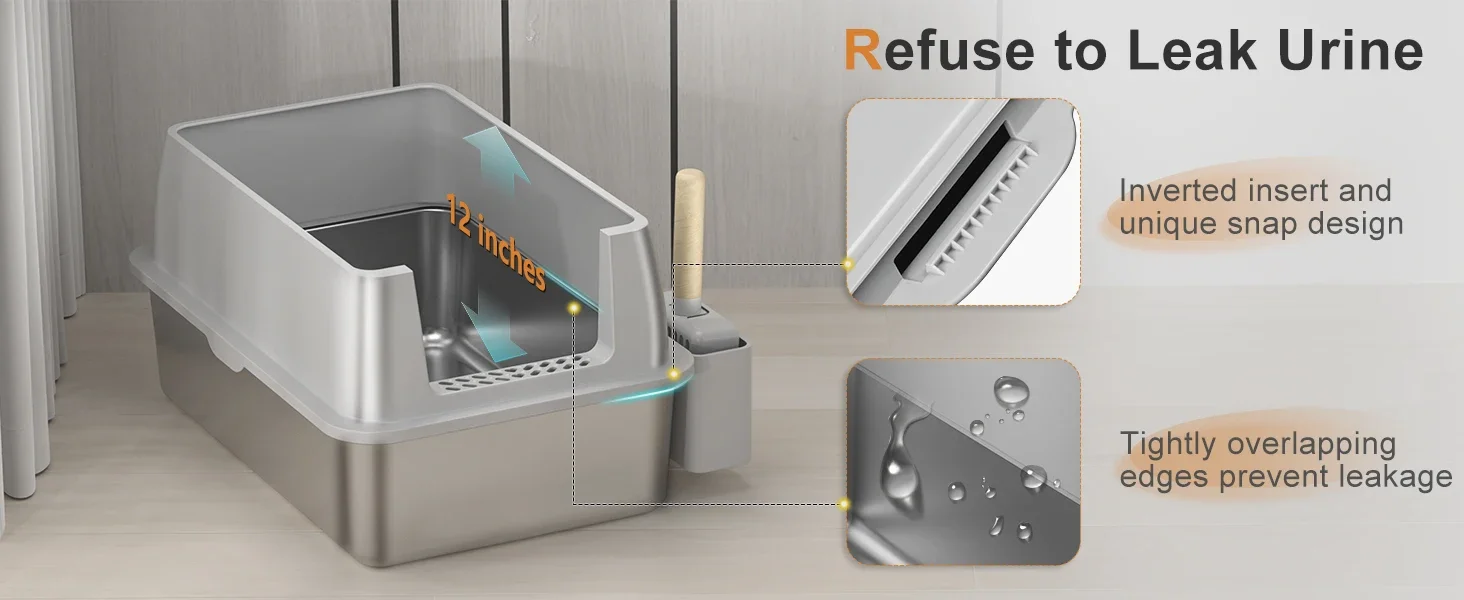 【PREVENT URINE LEAKS】 Our stainless steel litter box features a sturdy 6-inch high-sided outer shell and a 4-inch top cover.The premium inverted board and overlapping design effectively keep urine contained within the metal cat litter box, preventing it from leaking through gaps.This design also addresses the issue of litter scattering when cats dig.It completely solves the problems of urine leaks and cat litter spills, making it a godsend for cats with frequent and high urination.