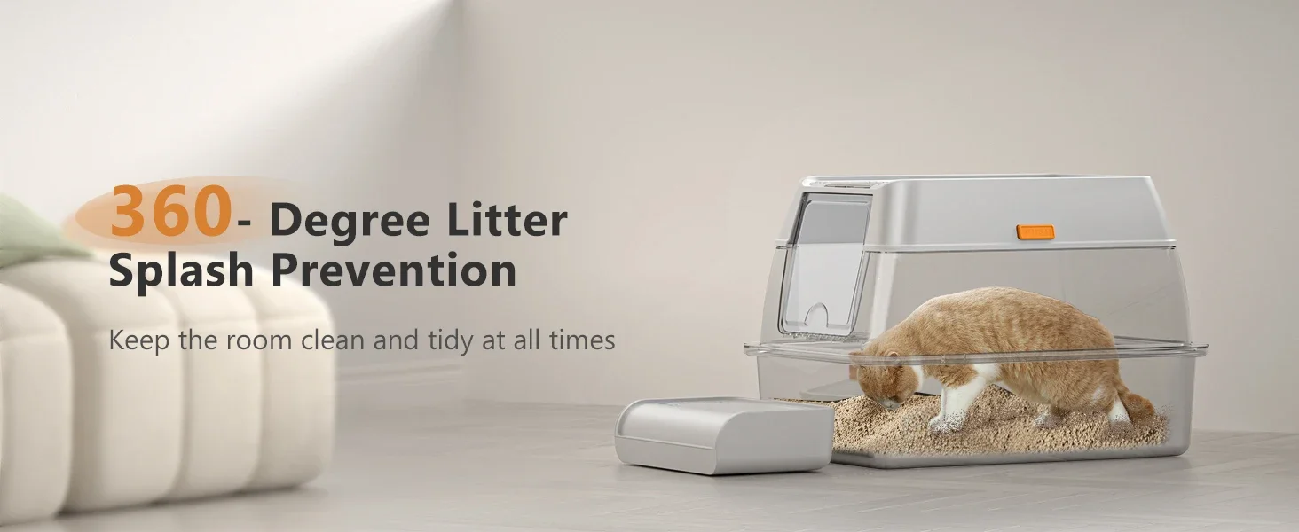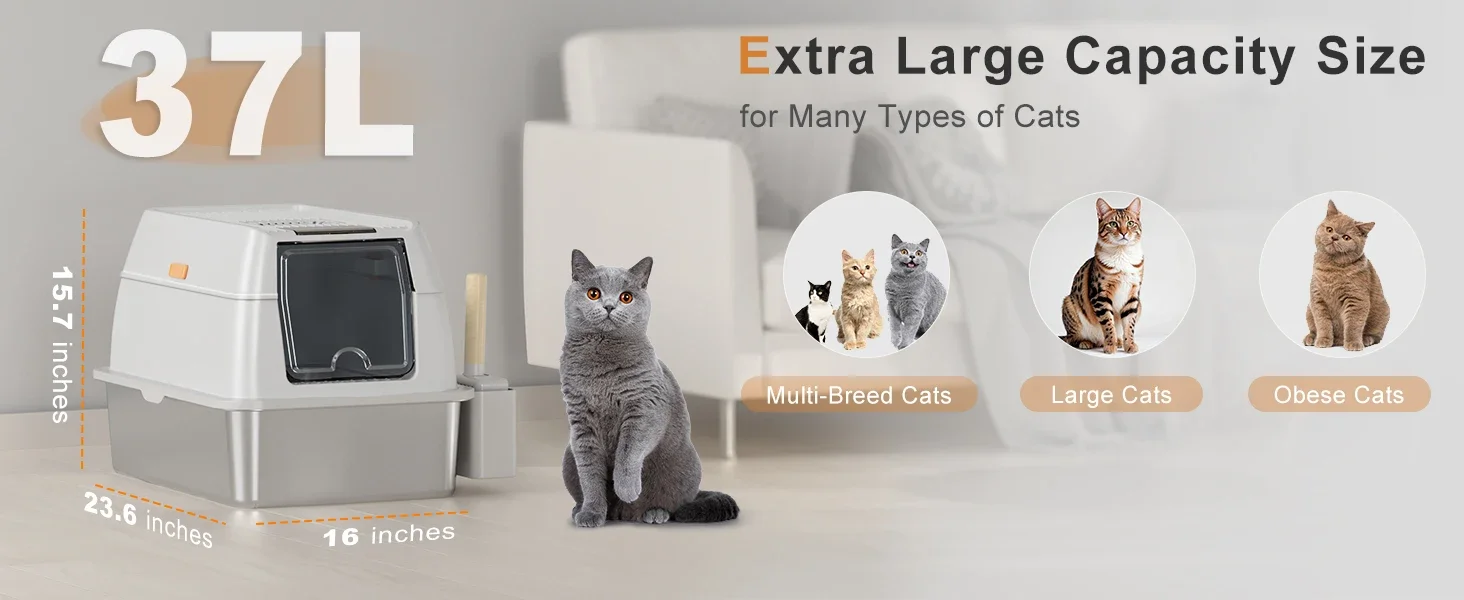 【EXTRA LARGE CAT LITTER BOX】 The XL cat litter box is perfect for large cats, measuring 23.6 x 15.7 x 16 inches.It provides ample space and can hold up to 37 liters of cat litter, sufficient for an adult cat for 30 days.This means you can go to work or travel without worrying about changing the cat litter.