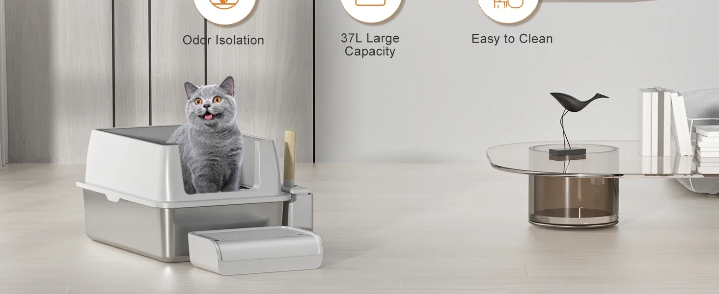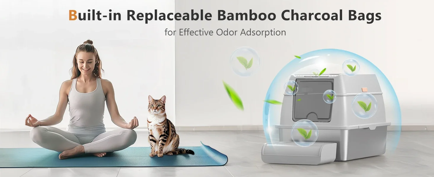 【EASY TO CLEAN AND ODORLESS】 The stainless steel litter boxes is made of good quality ABS material and 304 stainless steel.Unlike plastic litter boxes, the stainless steel litter box does not absorb any odors.It also features a deodorizing compartment for placing bamboo charcoal bags to absorb smells quickly.The smooth surface is non-stick and easy to clean.The sturdy stainless steel tray will not rust or scratch like plastic trays and is built to last.