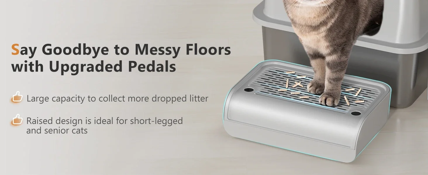 【HIGHER FOOTREST DESIGN】 Our stainless steel cat litter box with lid features a raised foot pedal, making it ideal for short-legged and senior cats.It provides easy access and can store more scattered litter that falls off your cat's paws.The inside of the footstep can hold a trash bag for convenient removal of the scattered litter, keeping your floor clean and tidy.