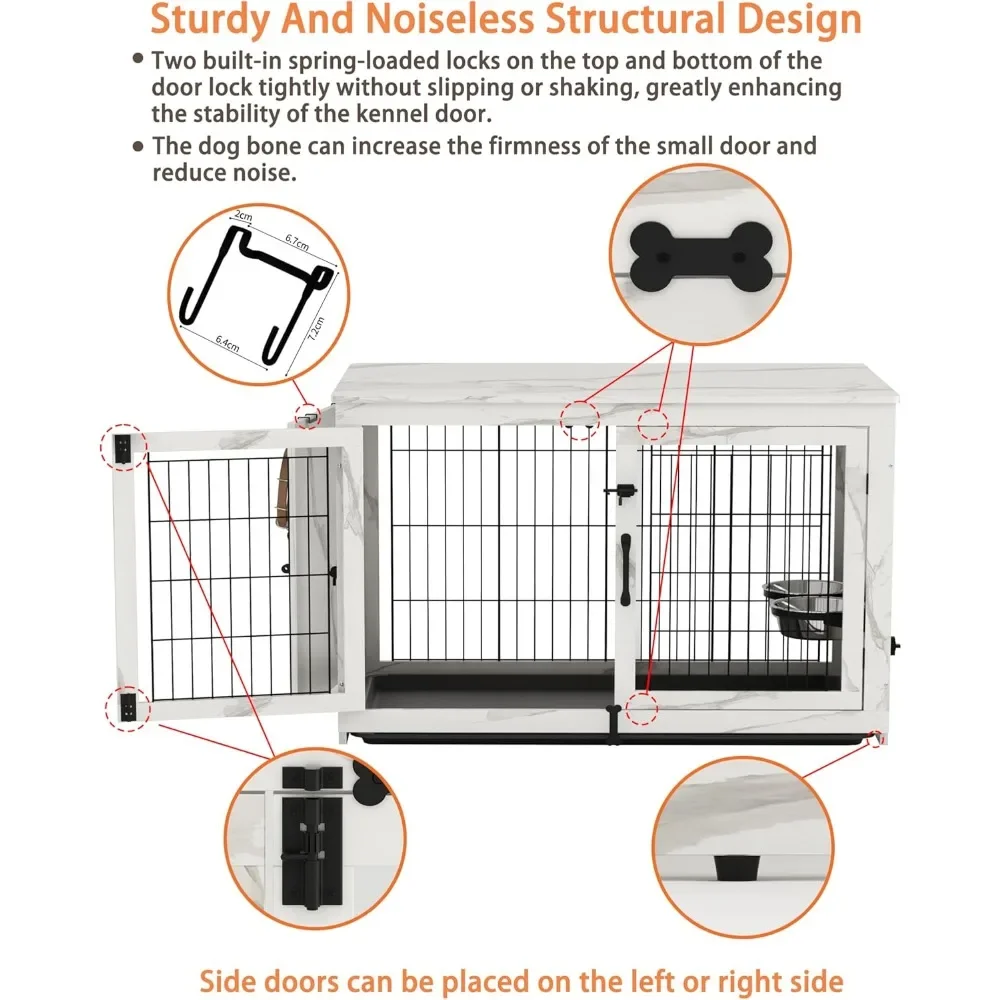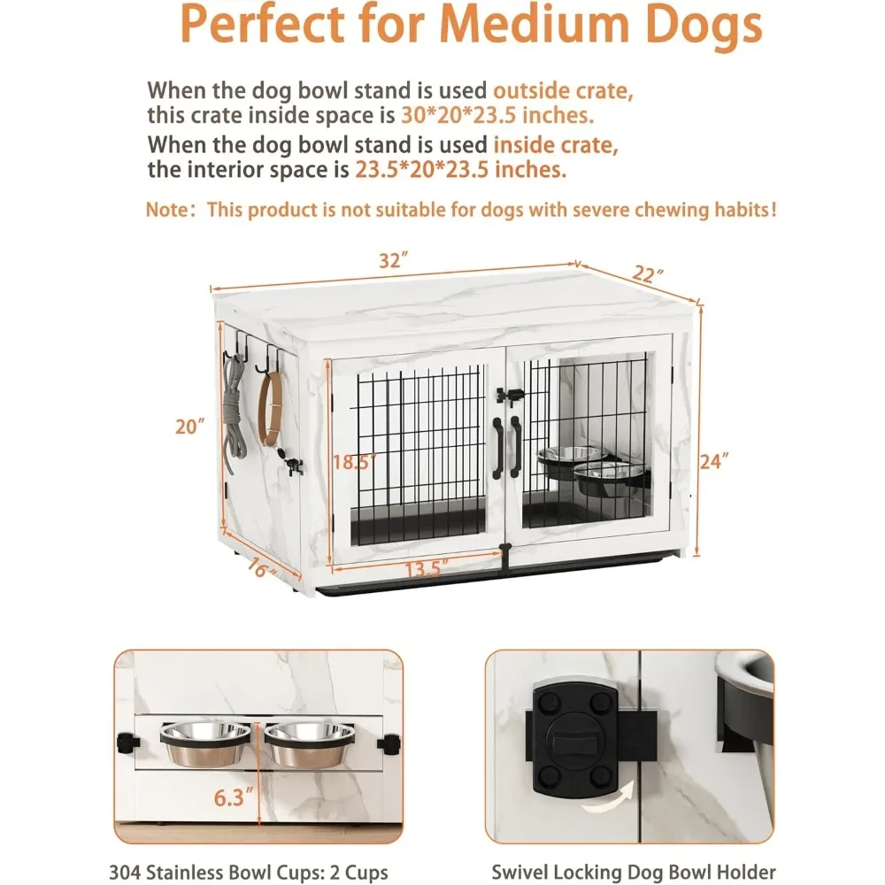 Wooden Dog Crate Furniture with 360°Rotatable Removable Dog Bowls, Dogs Crate End Table with Tray, Double Doors Dogs Kennels