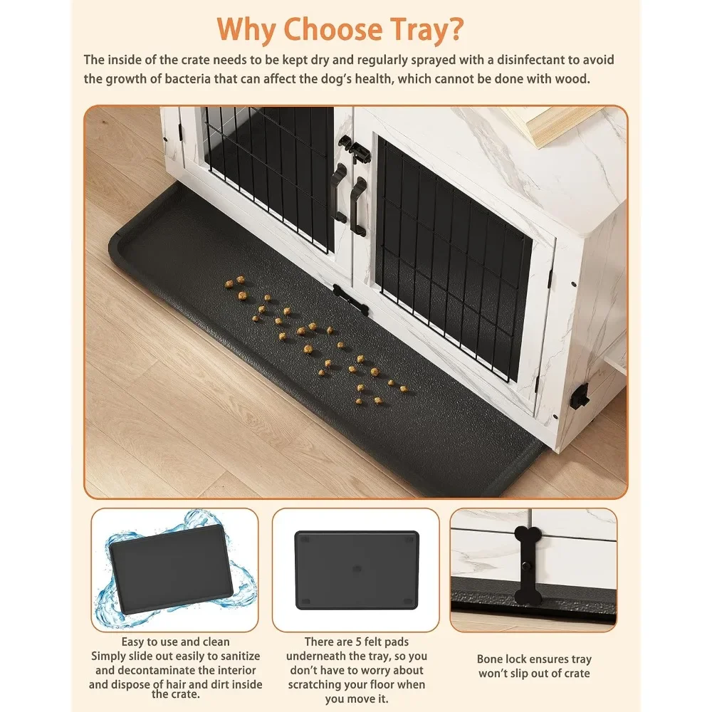 - 【Easy-to-clean Tray】: The interior of the dog crate needs regular disinfection and cleaning of fur and dirt. The durable, odor-resistant tray can be easily pulled out and cleaned in case of accidents, something a wooden board can't do. (The tray comes with felt pads underneath to protect your floor from scratches)